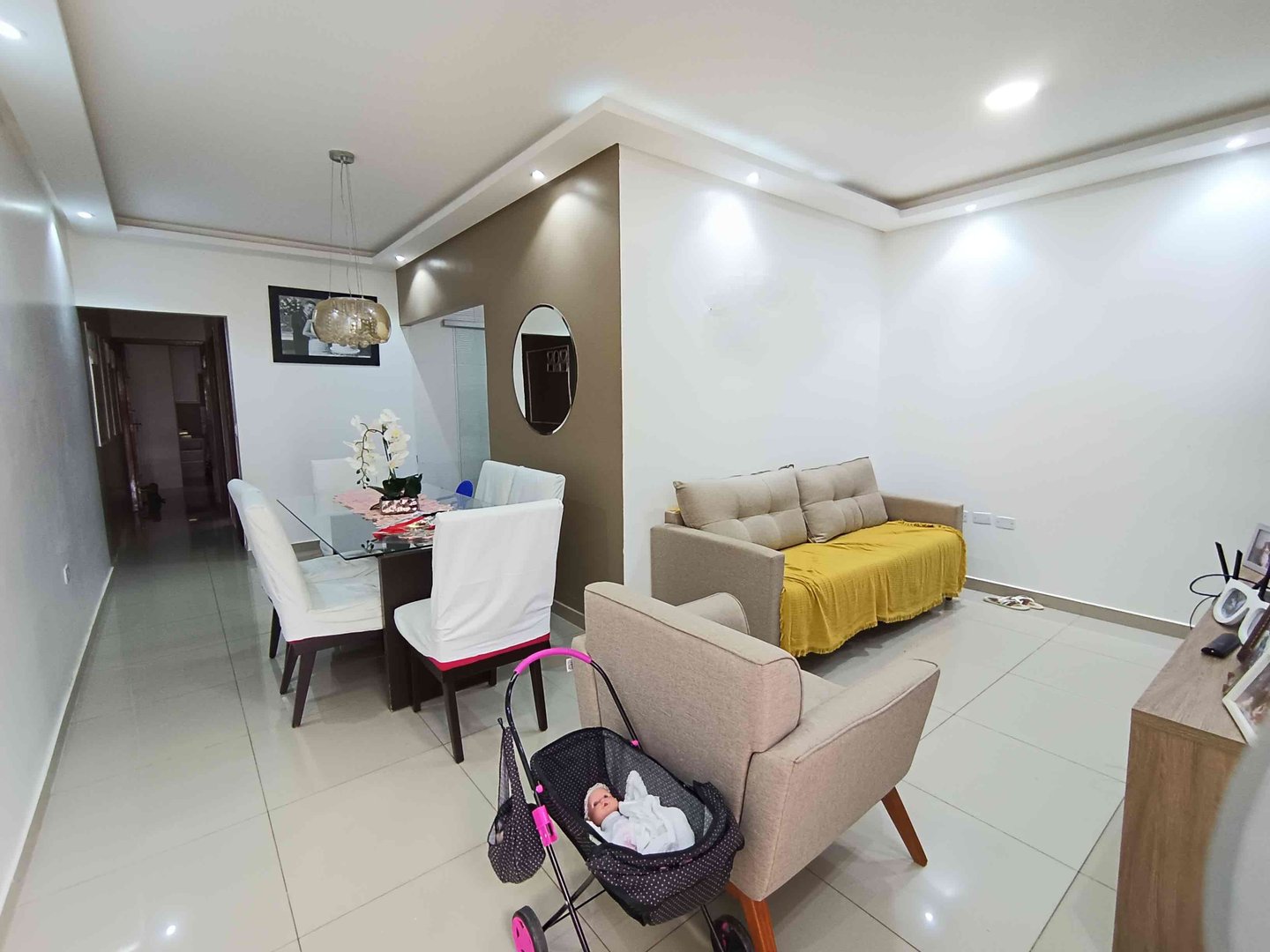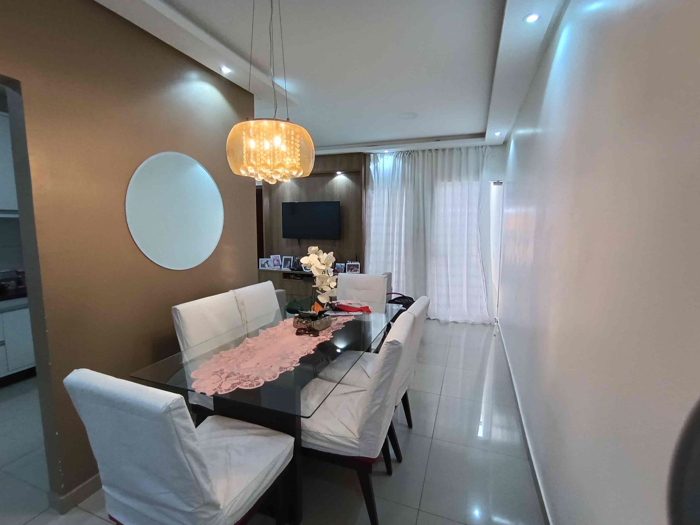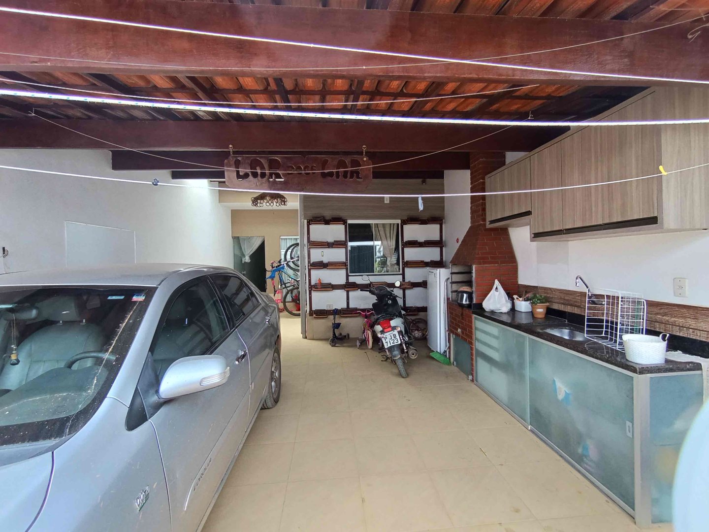 A casa oferece uma garagem ampla, 3 quartos sendo 1 suíte, sala moderna integrando a área de jantar com a cozinha.